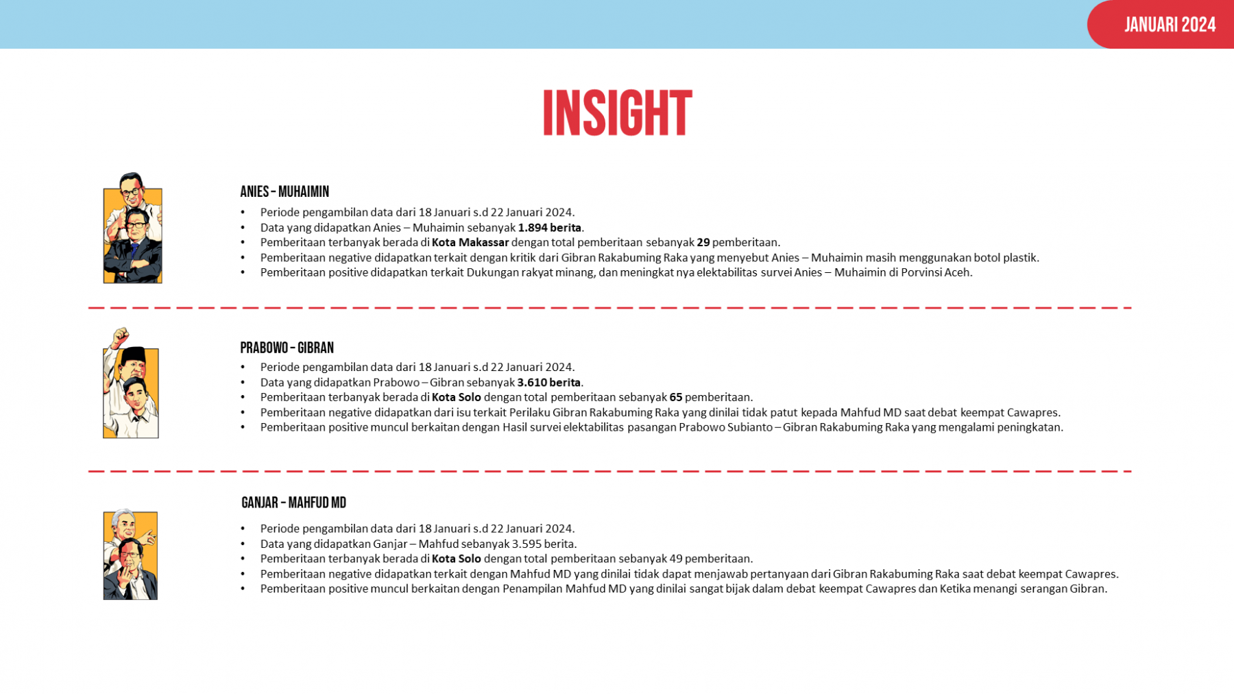 Dari hasil monitoring tersebut didapatkan beberapa hal yang telah dijadikan kedalam insight terkait pemberitaan terhadap pasangan Calon Presiden dan Calon Wakil Presiden 2024 mendatang. Salah satu insight yang didapatkan seperti, pemberitaan terbanyak untuk pasangan Anies - Muhaimin (AMIN) terdapat di Kota Makassar dengan total 29 berita. Selain itu pemberitaan pasangan Prabowo - Gibran (PRABU) paling banyak terdapat di Kota Solo dengan total 65 berita. Lalu terakhir pemberitaan terbanyak untuk pasangan Ganjar - Mahfud MD (GAMA) terdapat di Kota Solo dengan total 49 berita.