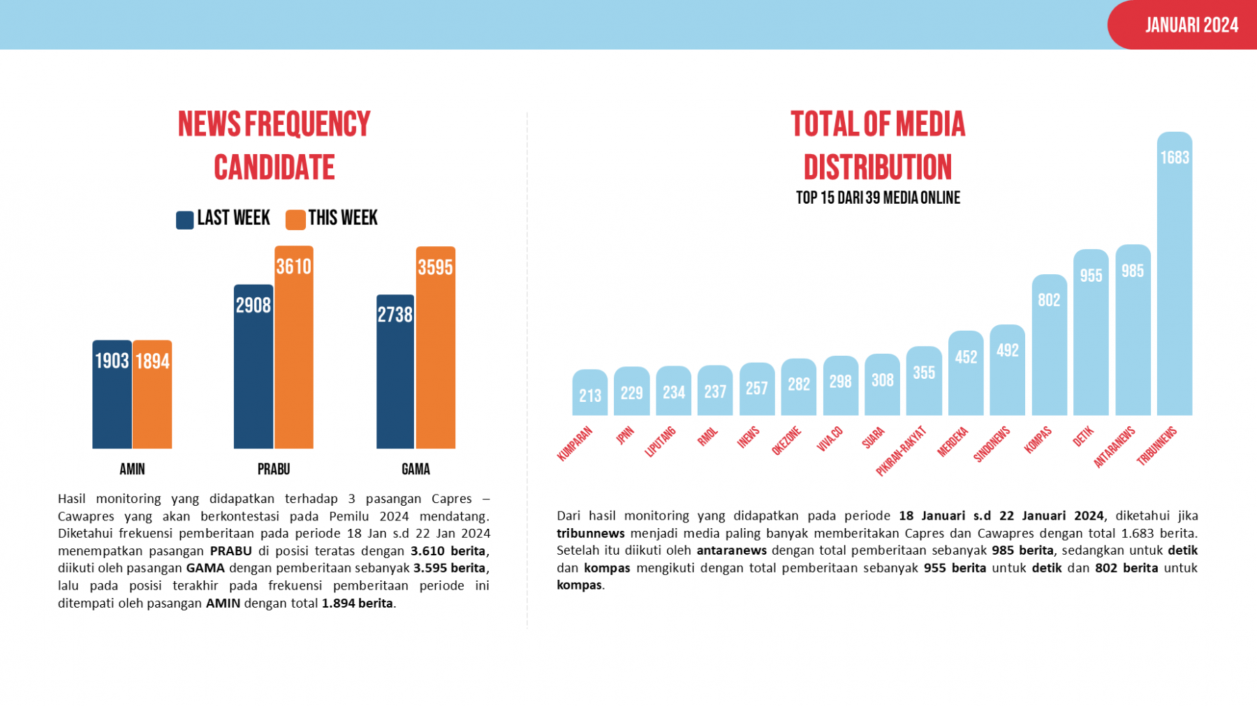 Frekuensi pemberitaan yang didapatkan dari hasil monitoring online news terhadap pasangan Calon Presiden dan Calon Wakil Presiden menempatkan pasangan Prabowo - Gibran (PRABU) di posisi teratas terkait pemberitaan pada online news dengan total pemberitaan sebanyak 3.610 berita, diikuti oleh pasangan Ganjar - Mahfud (GAMA) dengan total pemberitaan sebanyak 3.595 berita dan terakhir ada pasangan Anies - Muhaimin (AMIN) dengan total pemberitaan sebanyak 1.894 berita untuk periode 18 Januari s.d 22 Januari 2024.