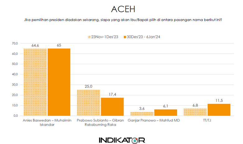 Menurut Direktur Eksekutif Indikator Politik Indonesia, Burhanuddin Muhtadi, pasangan Prabowo-Gibran mampu menguasai sejumlah provinsi di Pulau Sumatera. Mulai dari Lampung dengan dukungan sebesar 68,7 persen hingga Sumatera Utara dengan 44,2 persen. Namun, Aceh menjadi pengecualian dengan pasangan Anies Baswedan dan Muhaimin Iskandar mendominasi dengan 65 persen pemilih.