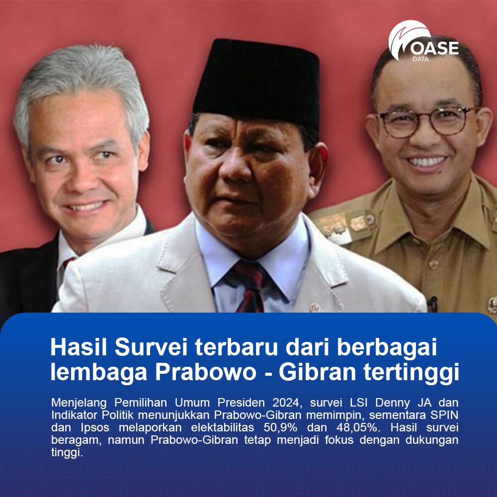 OASEDATA - Lembaga survei Indikator Politik Indonesia merilis hasil survei terkini dengan Dinamika Elektoral Di Tingkat Nasional Dan 13 Provinsi Kunci. Hasil survei menunjukkan dominasi pasangan calon Presiden dan Wakil Presiden, Prabowo Subianto dan Gibran Rakabuming Raka, di beberapa provinsi strategis di Indonesia.